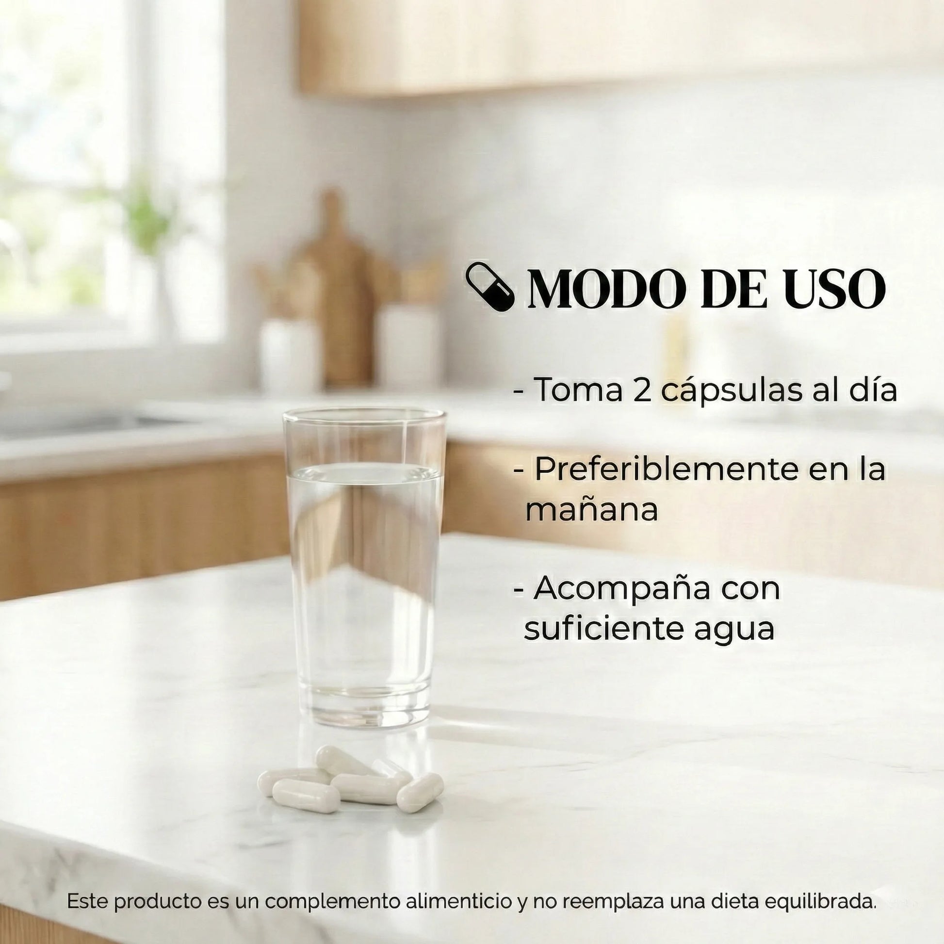 Se recomienda tomar 2 cápsulas al día, preferiblemente en la mañana con el desayuno y suficiente agua.